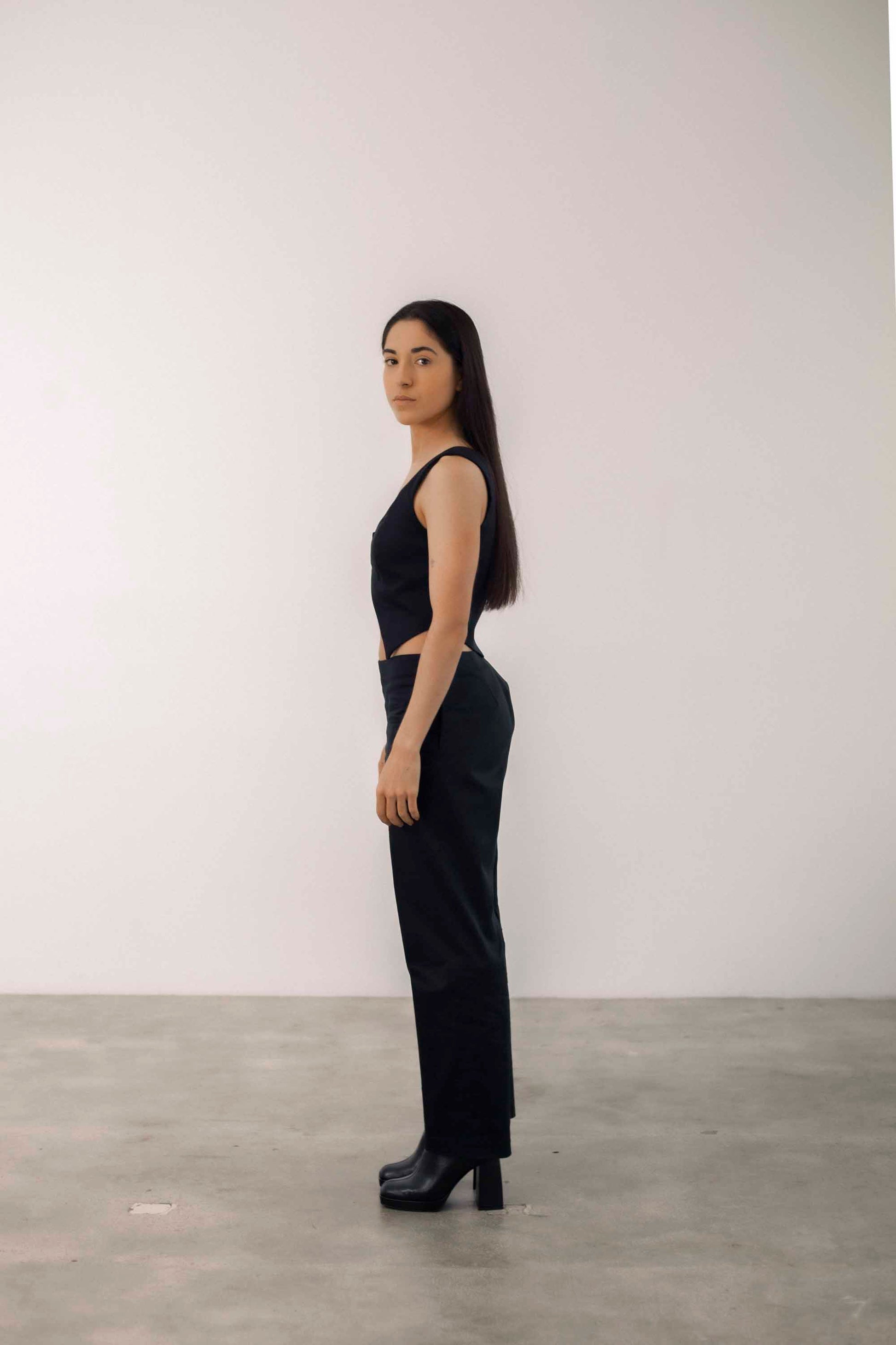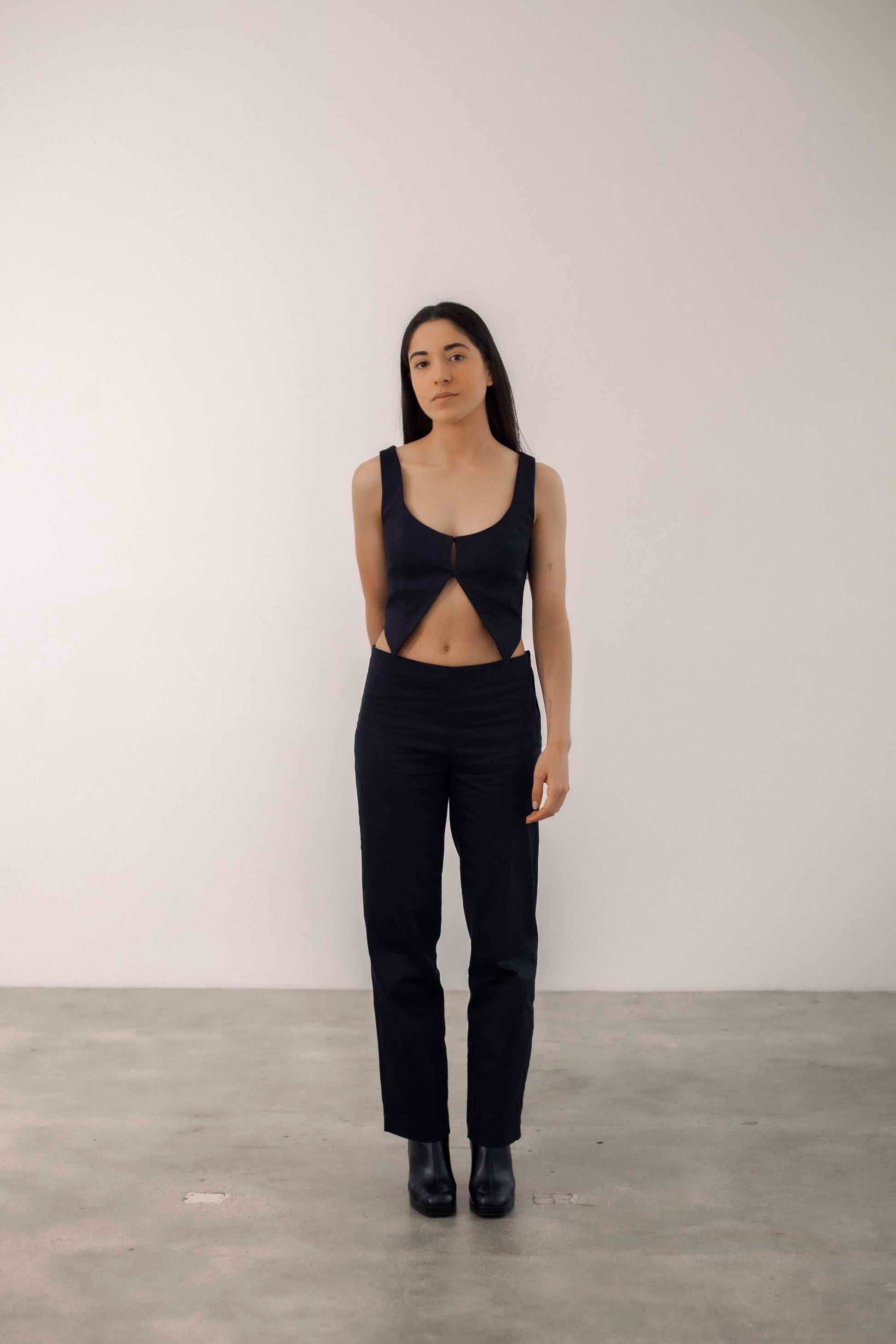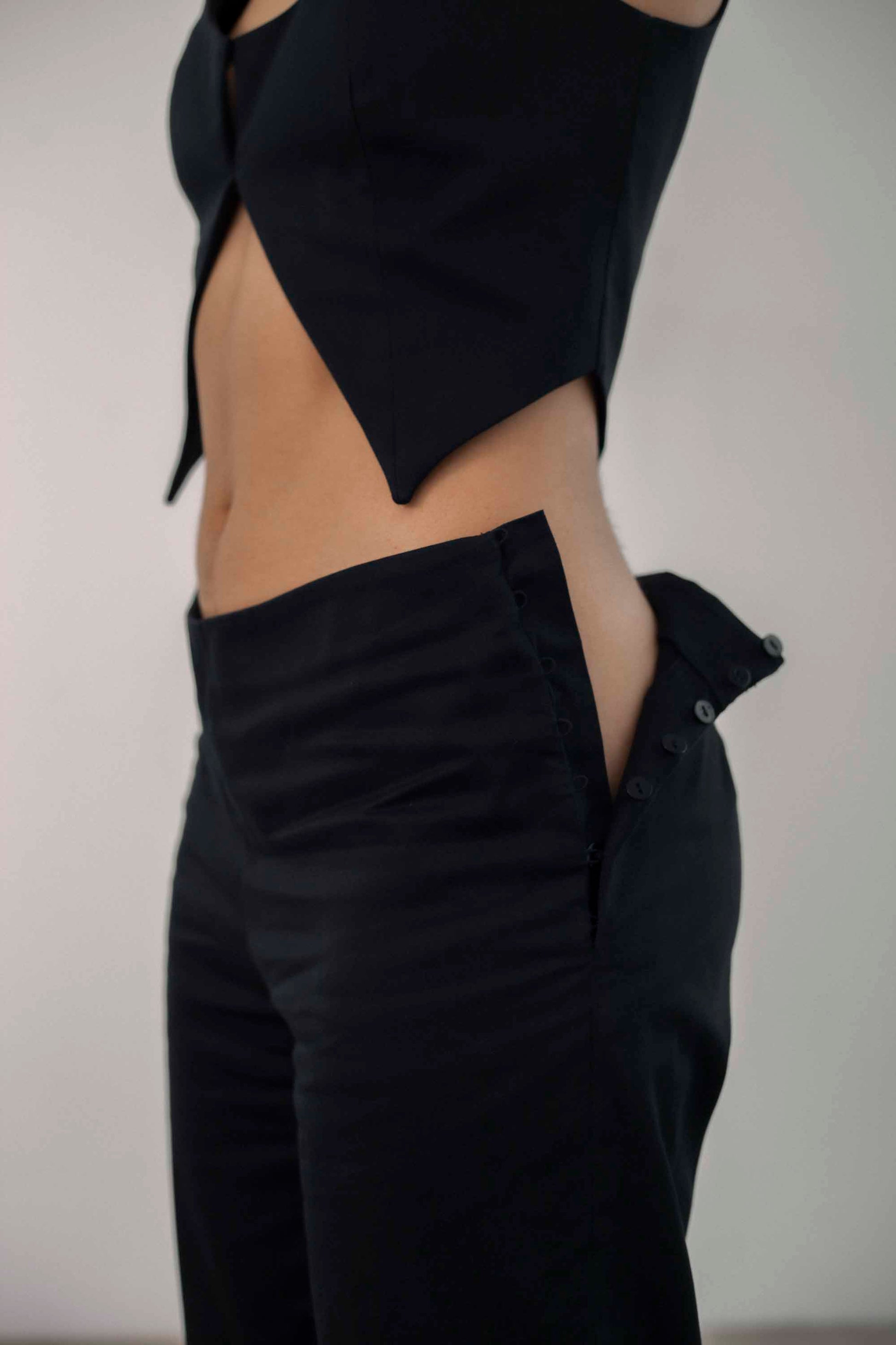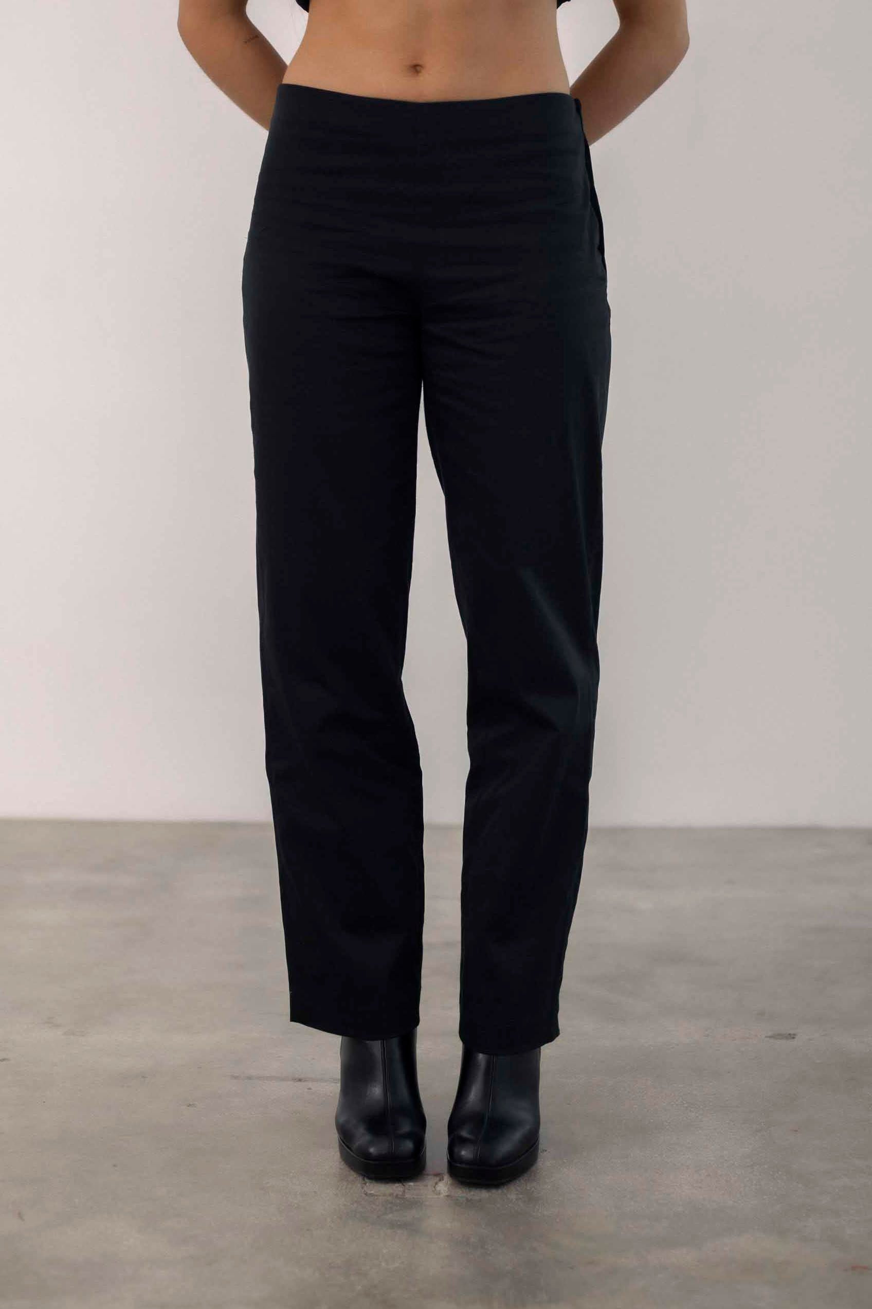 Straight leg low rise pants with button fastening on left side. Made in Barcelona.